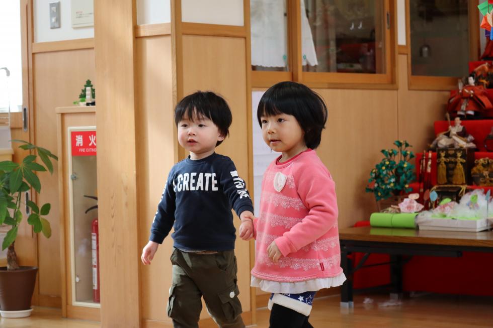 手に持っているのは、自分で製作した「おひなさま様とおだいり様」です。上手にできたね~