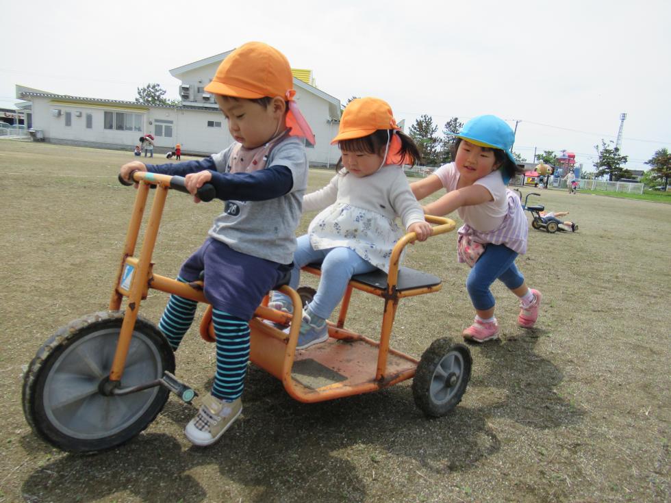 グラウンドでは乗り物に夢中・・・やさしいお姉ちゃんが押してくれてます🚴